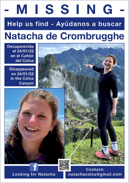 Natacha de Crombrugghe, desde el pasado 24 de enero, lleva más de 80 días de desaparecida en Cabanaconde, Caylloma, Arequipa. La búsqueda durante el primer mes del hecho fue con ...
